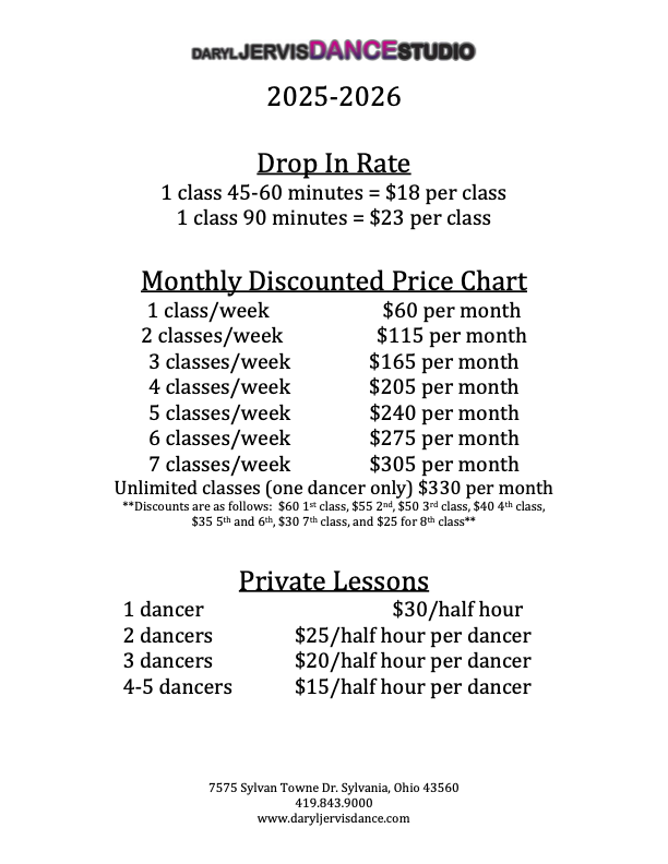 Here at Daryl Jervis Dance Studio we offer a wide range of classes in many different types of dance to students of various ages. Use the schedule below to find the right class for you and/or your child.